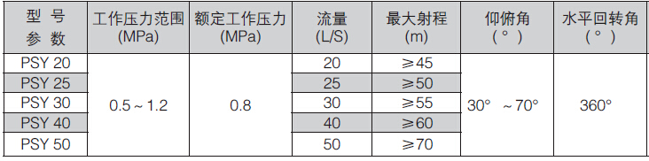 该炮喷头采用导流式原理设计、流量大、水流集中、射程远、功能多、即可做直流又可做喷雾喷射,流量可根据要求在(20~50)L/S范围内调节,操作灵活方便,炮身即可水平回转又可仰俯回转,并可实现定位锁紧等功能,有利于操作人员撤离现场,实施无人操作。